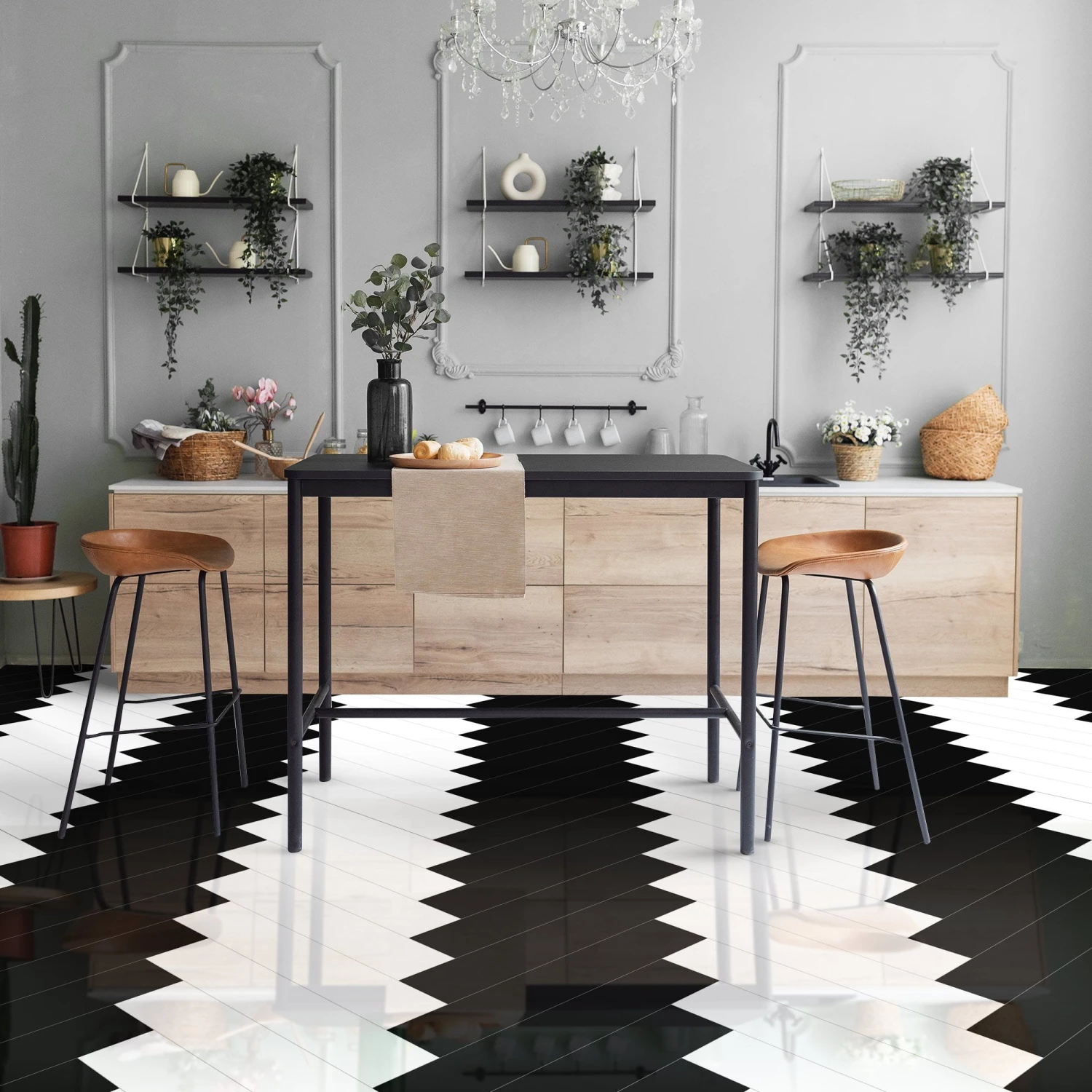 Sold as a pair of 1.75m² packs totalling to 3.5m², this flooring is perfectly measured to assist in planning and installation. The Black & White Lustre Herringbone vinyl flooring is not only a stylish choice but also practical for a range of applications, making it a favored option for discerning UK property owners seeking functionality and flair in their flooring solution.