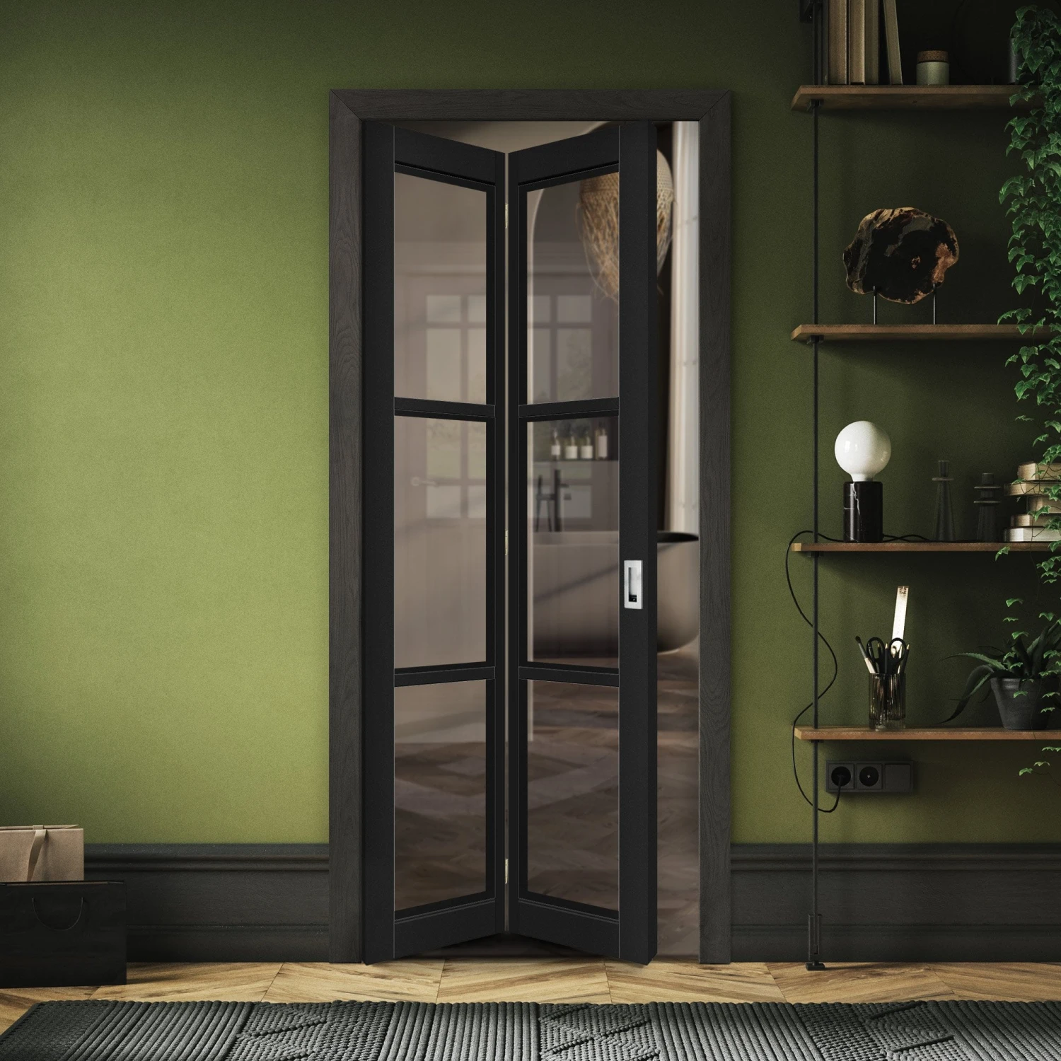 Enhance your interior with the Liberty Doors Jet Black Internal Fully Finished Industrial Studio 3 Light Clear Glass Bi-fold Door, blending style and functionality effortlessly. Crafted from premium timber and featuring clear toughened safety glass, this door invites light into any space, enhancing the industrial studio aesthetic. The pre-finished jet black frame complements modern interiors, adding a sleek touch to your home.