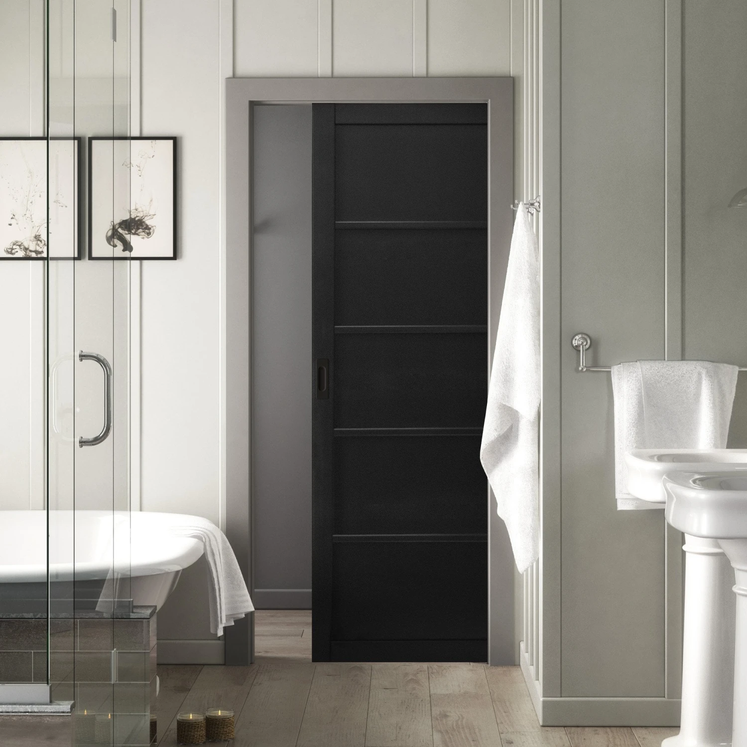 Introducing the Black Internal Fully Finished Industrial Studio 5P Classic Framed Pocket Door Set from Liberty Doors, a perfect amalgamation of style and functionality for the modern UK home. This elegantly designed pocket door set features a striking black finish, lending an industrial yet sophisticated touch to your interiors. The set is ideal for those looking to combine contemporary design with practical, space-saving solutions.