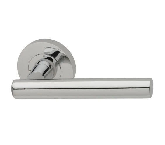 The Lynx Polished Chrome Lever Handle On Round Rose are a luxurious pair of lever door handles boasting a fantastic modern design & finished in a sleek polished chrome. Sold as a pair these handles are a perfect match for any chrome finished door accessories such as escutcheons, additionally these handles also come complete with their own set of fixings.