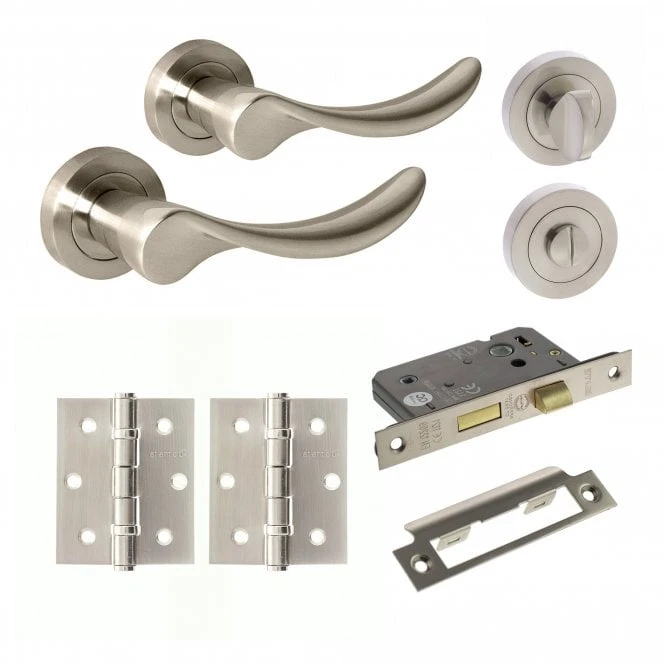 Components in this set: 2x Lever Handles, 2x Ball Bearing Hinges, 1x WC Turn & Release, 1x Bathroom Lock