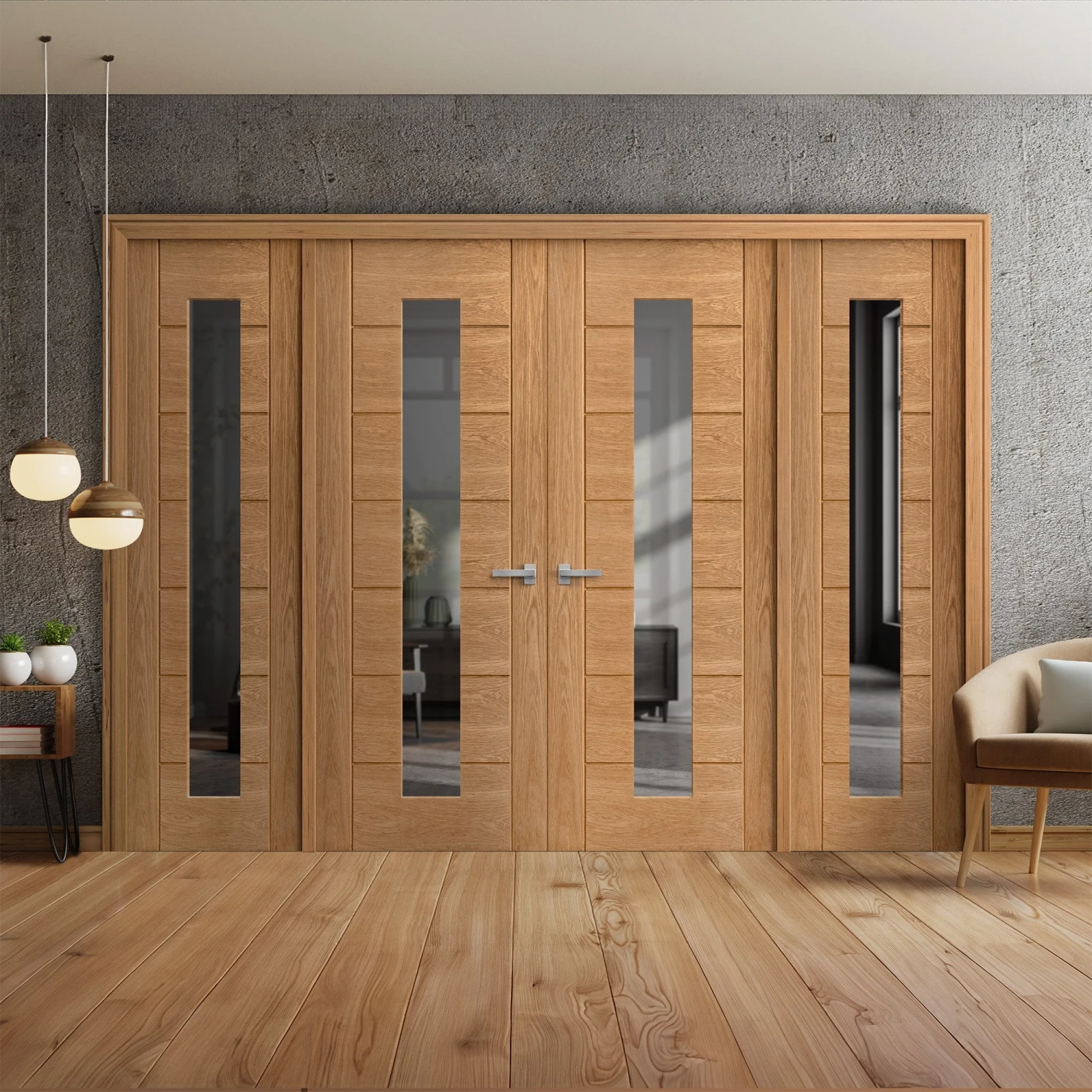 Elevate your interior design with the Internal Oak Fully Finished Pedrena Clear Glass Sidelight Room Divider Set. This elegant set includes four Pedrena 1L clear glass doors, ideal for creating a refined and sophisticated space.