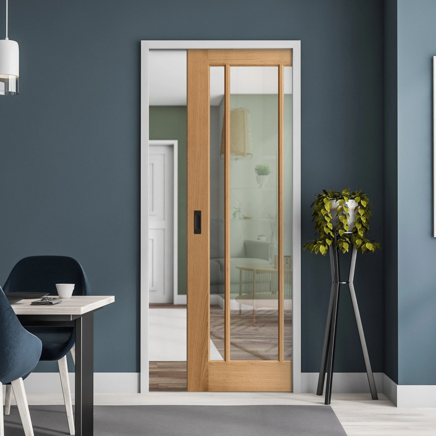 Transform your living space with the Oak Unfinished Toledo 3 Light Clear Glass Framed Pocket Door Set from Leader Online. This door set features a contemporary design with three clear glass panels, allowing natural light to flood into your room while maintaining a modern aesthetic. The unfinished oak frame offers the flexibility to customise the finish, making it an ideal choice for various interior styles.