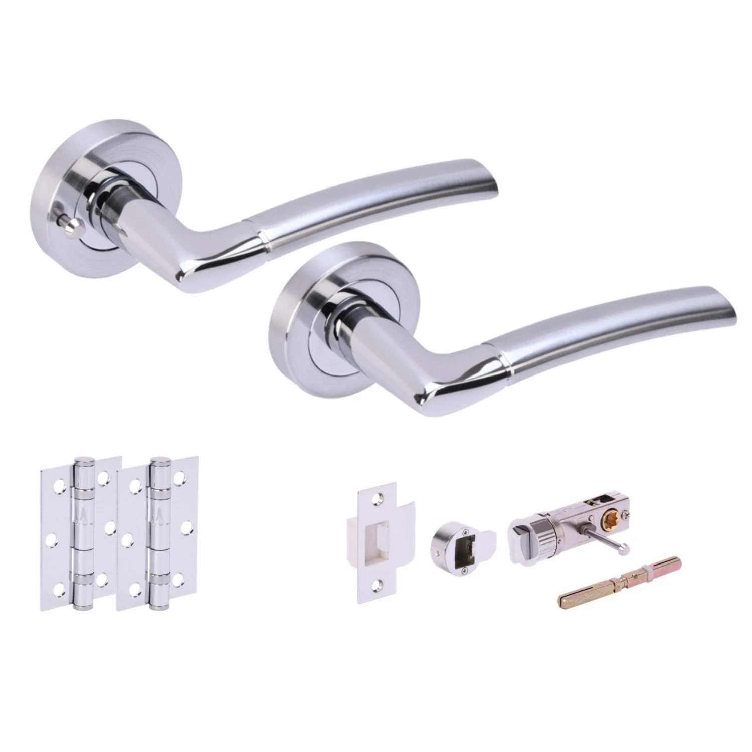 Upgrade your bathroom with the sophisticated Orbit Round Rose Lever Door Bathroom Handle Set, featuring a stylish blend of polished and satin chrome finishes. This handle set offers a modern twist to your bathroom doors, providing both visual appeal and functionality. The lever handles are designed for ease and comfort, making them suitable for frequent use. Equipped with a single privacy bullet latch for added security and privacy, and ball bearing hinges for smooth, enduring operation, this set is perfect for any contemporary bathroom setting.