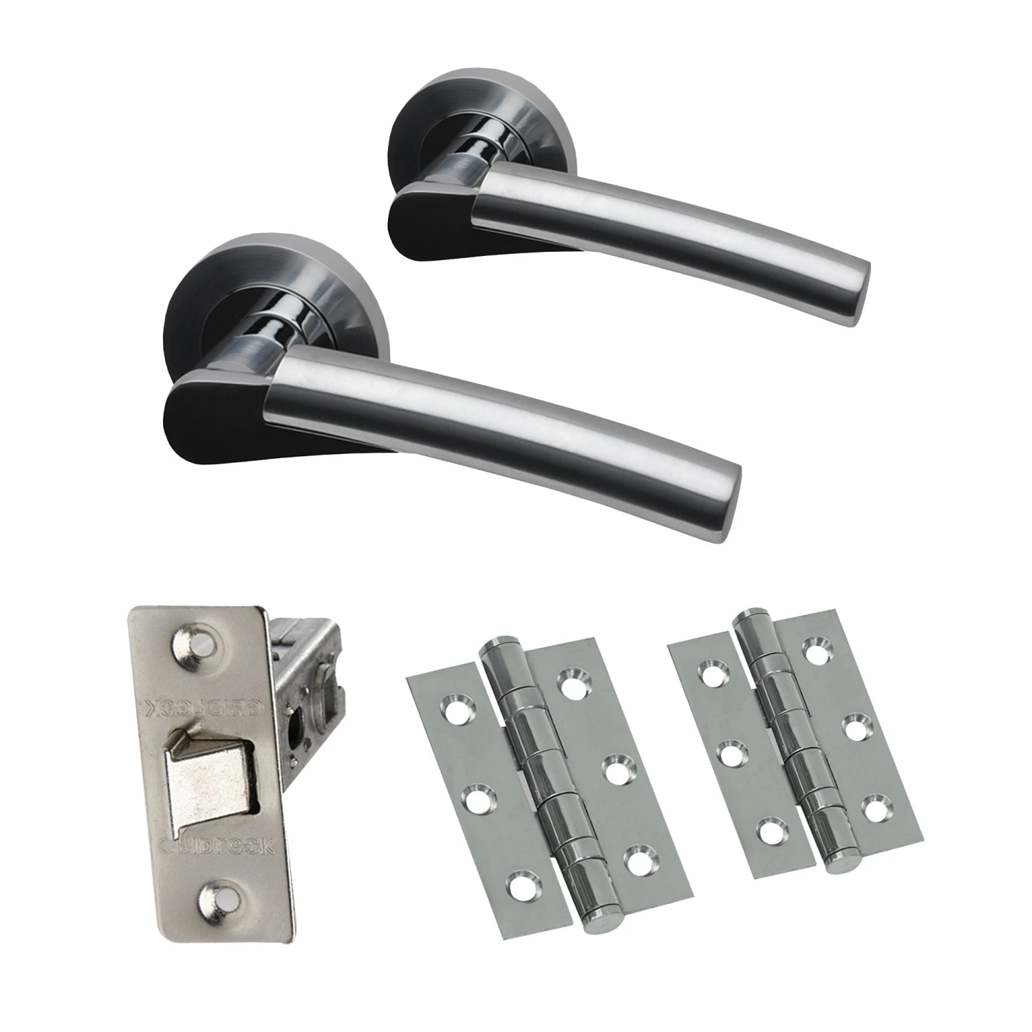The Premium Ruby Lever On Round Rose Handle Pack, Two-Tone Chrome (RUB09.PCP/SCP) pack contains 1 set of stylish Ruby PCP/SCP Lever On Rose Handles, 1 pair of HST.75.CP.BT Chrome Button Tipped Hinges and 1 65mm Nickel Plated Tubular Mortice Latch, which together will create the ultimate look.