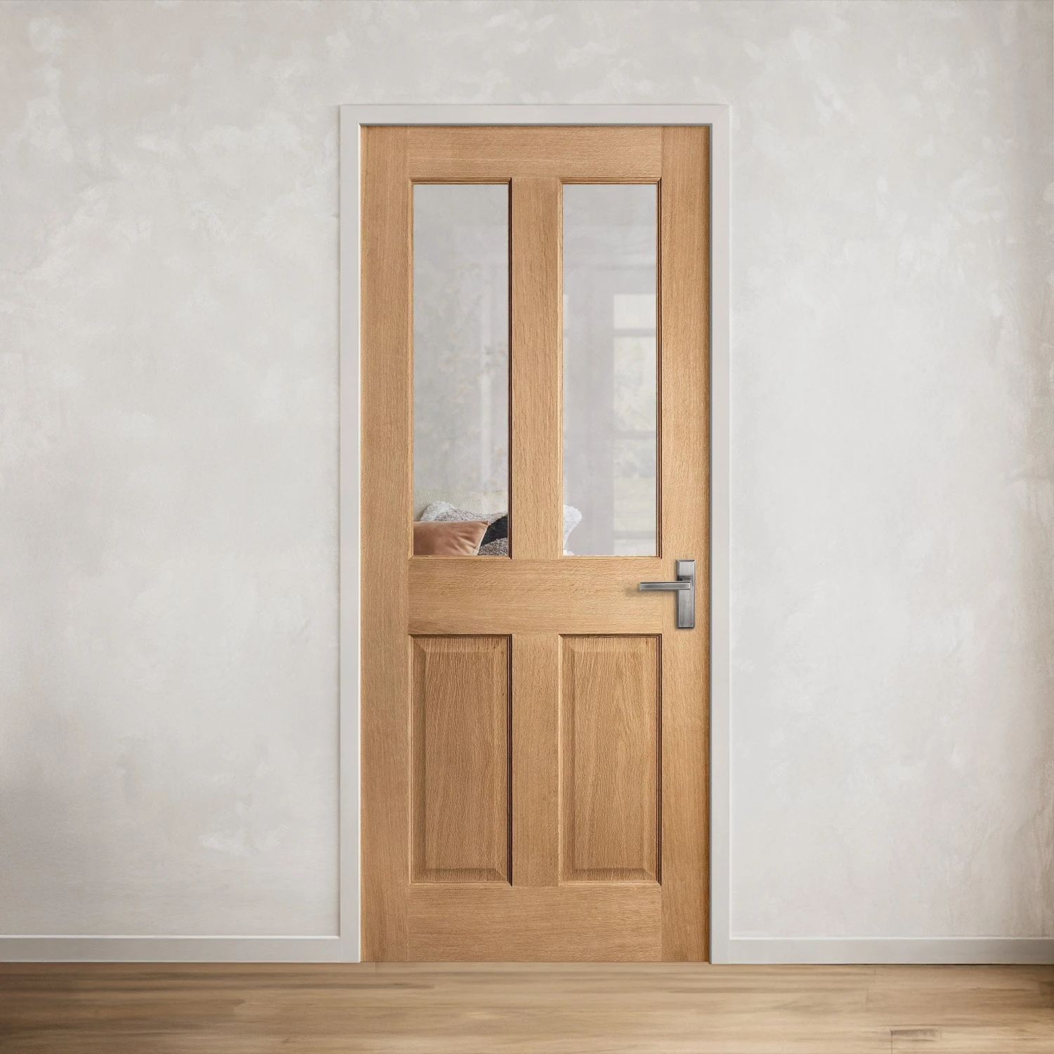 The White Internal Oak Camargue 1 Light Clear Glass Door is the perfect choice for homeowners seeking a stylish, durable, and light-enhancing door to complement their interiors.