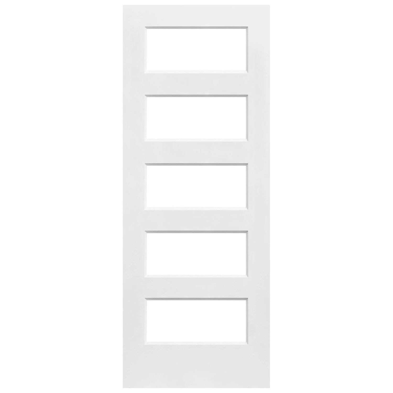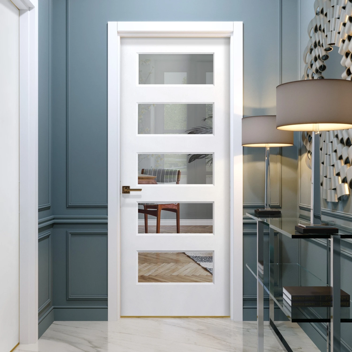 The Internal Harlem Clear Glass Door by Liberty Doors comes from their Internal White collection and is primed with a double coat, ready for a final finish. This particular design features a solid engineered core and is white primed meaning it is ready for a final coat or stain. This door allows trimming of 6mm from any side & sport 5 beautiful panes of clear glass.