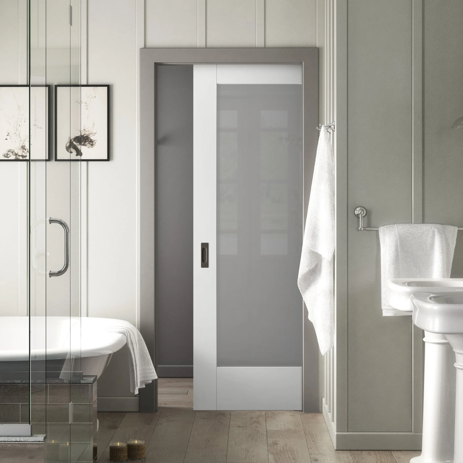 Transform your interior with the White Primed Internal Pattern 10 1 Light Obscure Glass Framed Pocket Door Set from Leader Online. This door set features a sleek, modern design, highlighted by a single obscure glass panel that offers privacy while allowing soft light to filter through. The door is primed in white, providing a smooth and versatile surface ready for your choice of final finish, making it an ideal addition to contemporary interiors.