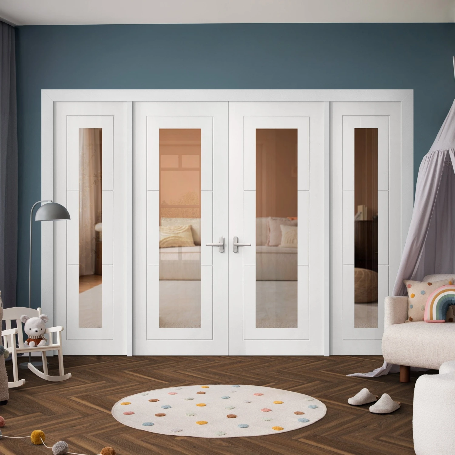 Elevate your interiors with the Internal White Primed Temple 1L Clear Glass Sidelight Room Divider Set. This set includes four pristine Temple 1L clear glass doors, each framed in a white primed finish, offering a refined and versatile solution for dividing spaces while maintaining an open, airy feel.