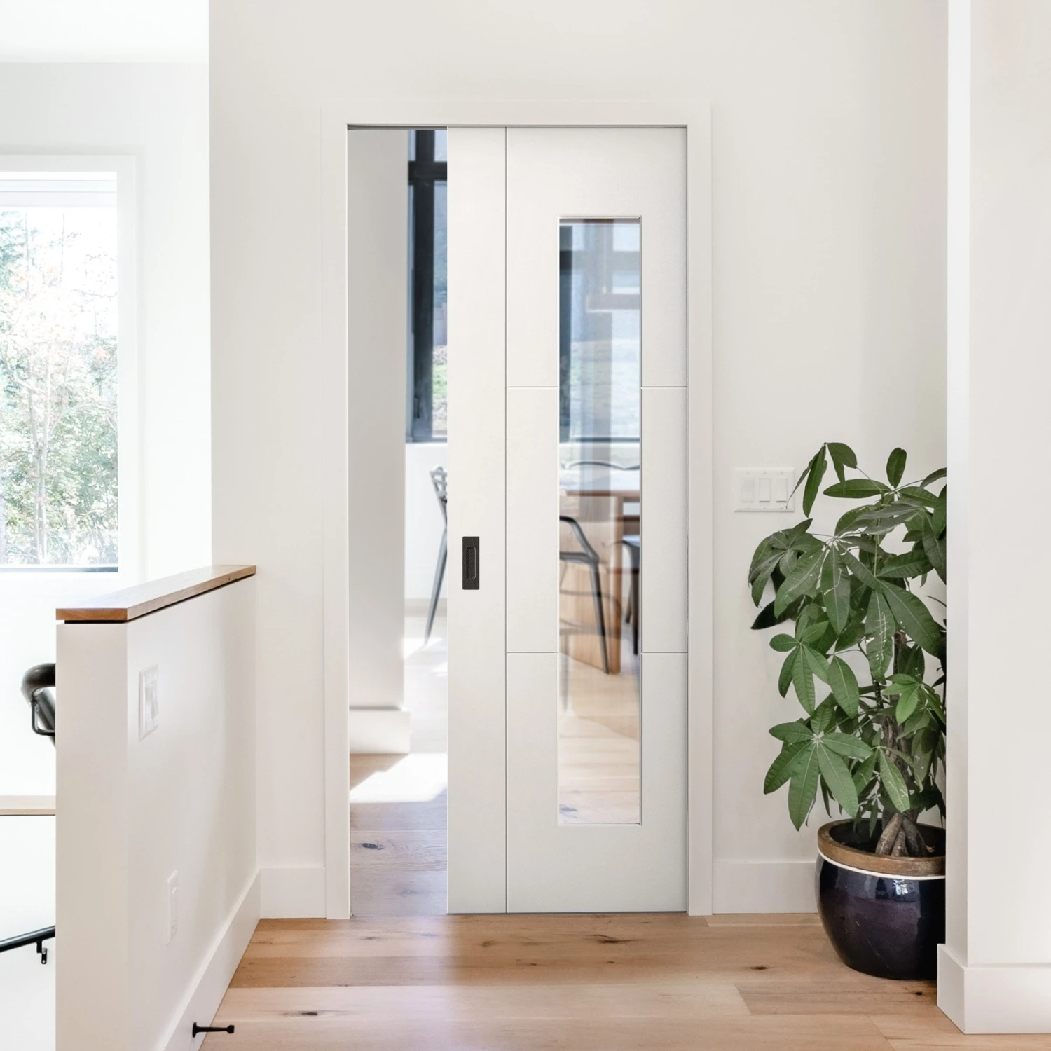 Enhance your living space with the White Primed Internal Trent 3 Panel 1 Light Clear Glass Framed Pocket Door Set from Leader Online. This door set features a refined 3-panel design, highlighted by a central clear glass panel that allows natural light to flow through, enhancing the brightness and openness of any room. The door is primed in white, offering a smooth and versatile surface ready for your choice of final finish, making it a perfect addition to both traditional and contemporary interiors.