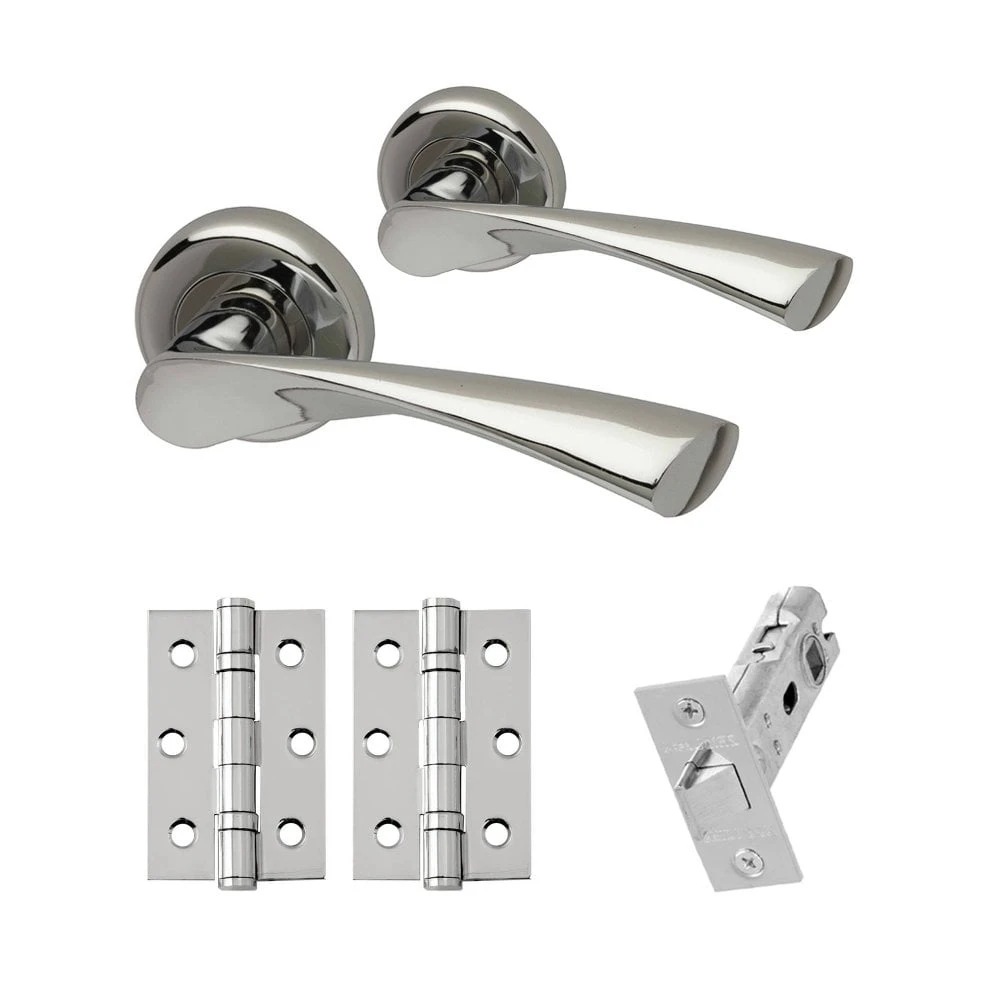 The Zeta Lever On Round Rose Handle Pack, Polished Chrome & Satin Nickel contains 1 set of Zeta CP/SN Lever On Rose Handles, 1 pair of HST.75.CP.75.BT Chrome Button Tipped Hinges, 1 65mm standard lock and also a stylish CP/SN turn and release, which together will create a innovative stylish look & feel for any door.